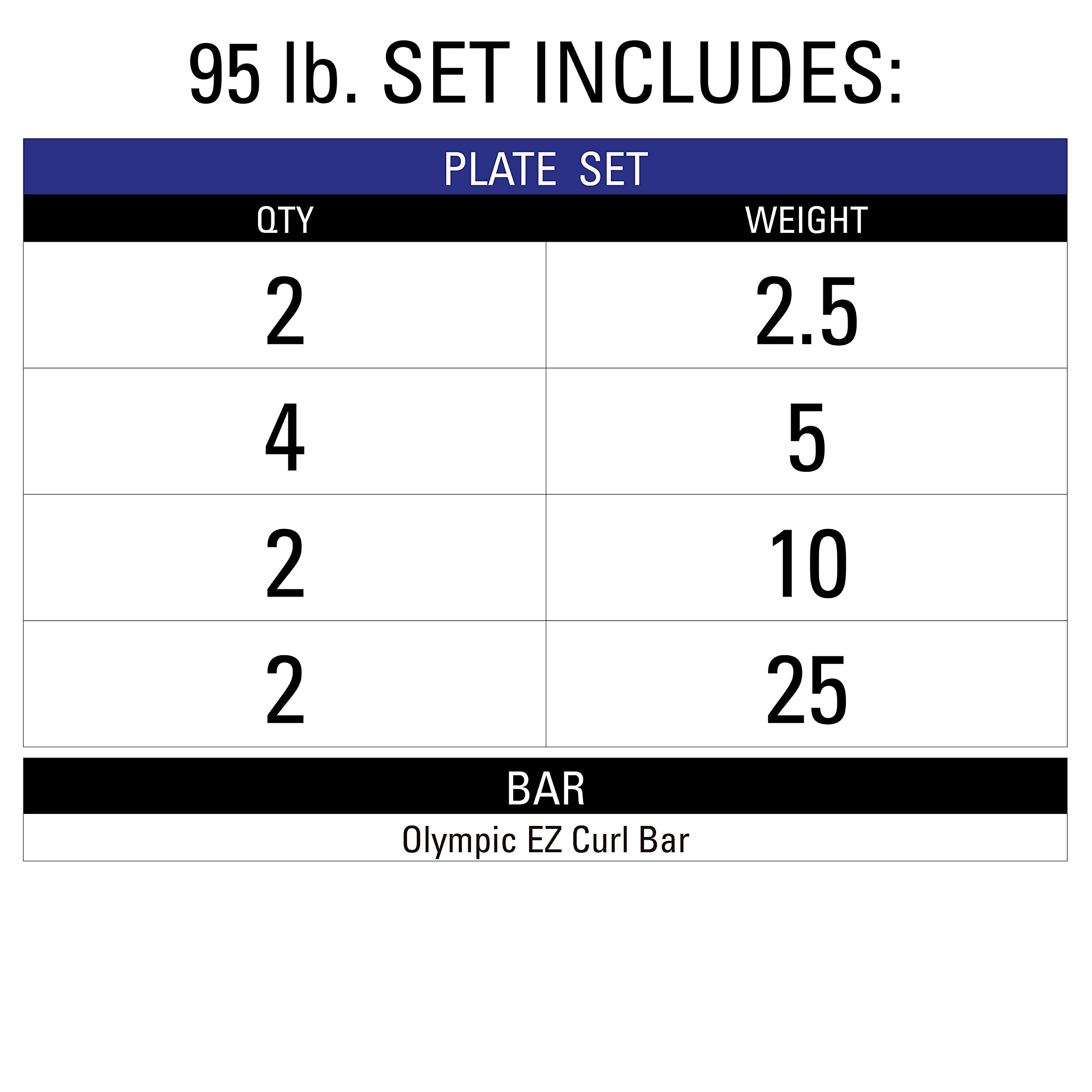 - Includes a 95 lb set of XMark TRI-GRIP premium quality rubber coated Olympic weight plates: (2) 25 lb, (2) 10 lb, (4) 5 lb, and (2) 2.5 lb and a XMark BLACKSMITH EZ curl bar with a 28mm grip. COLLARS NOT INCLUDED.